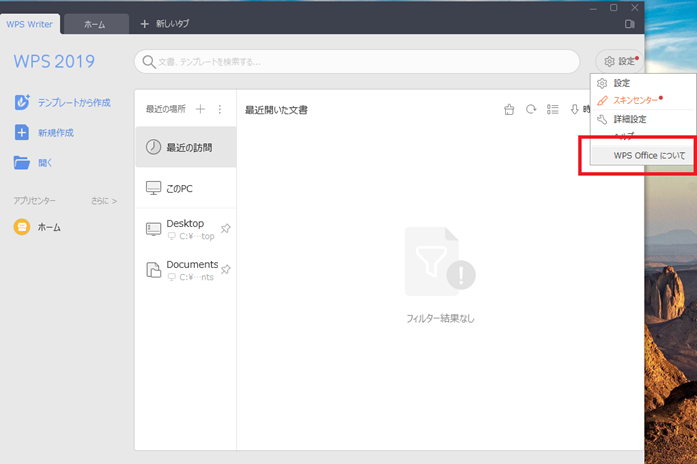 ①インストールされているWPS Officeを起動し、右上の「設定」から「WPS Officeについて」をクリックします。