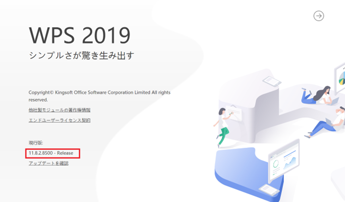 ②WPS Officeのバージョン情報が表示されますので、「11.8.2.8500」となっていれば現行バージョンのソフトウェアとなります。
